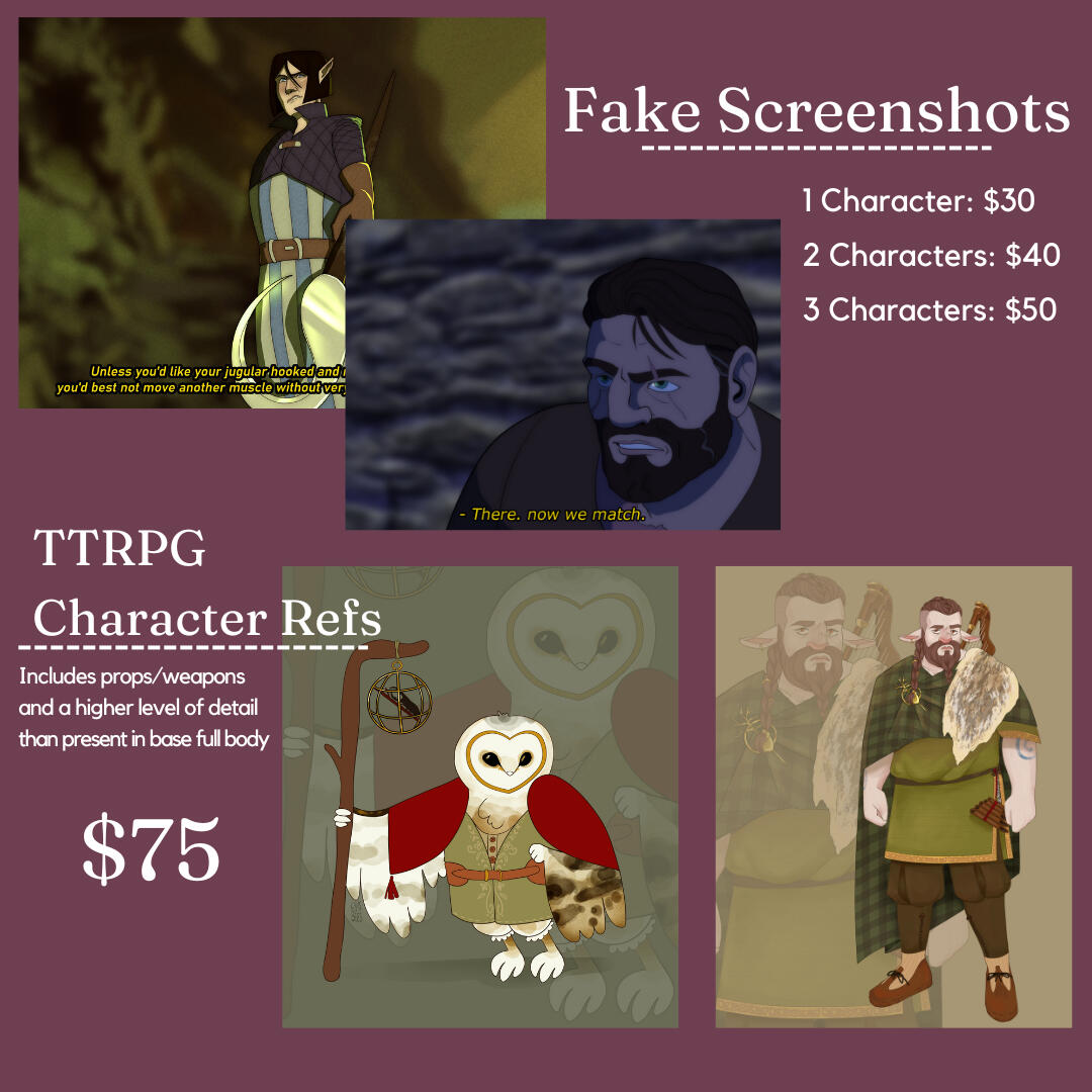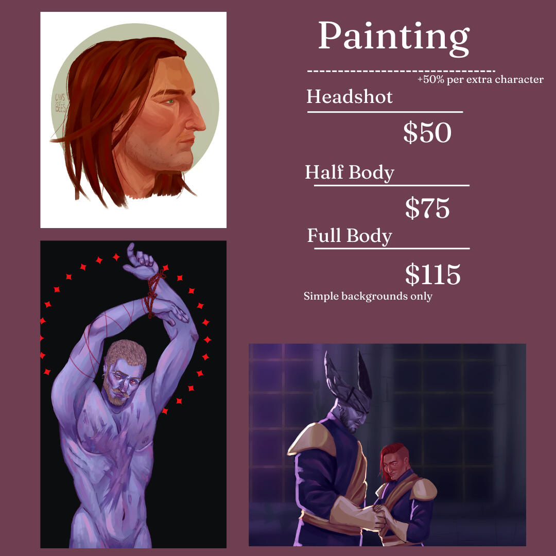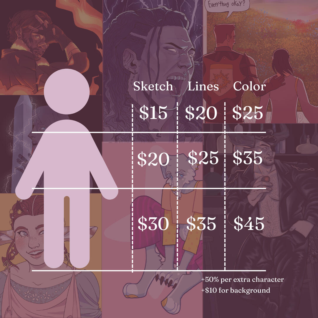 -All prices in USD-Commissions under 50 USD paid up front, any payments above that can be half up front / half after sketch approval.-Prices listed are for non-commercial use only. Commercial projects wiil be negotiated on a case-by-case basis.-My work will not be used in anything associated with NFT or the training of AI.